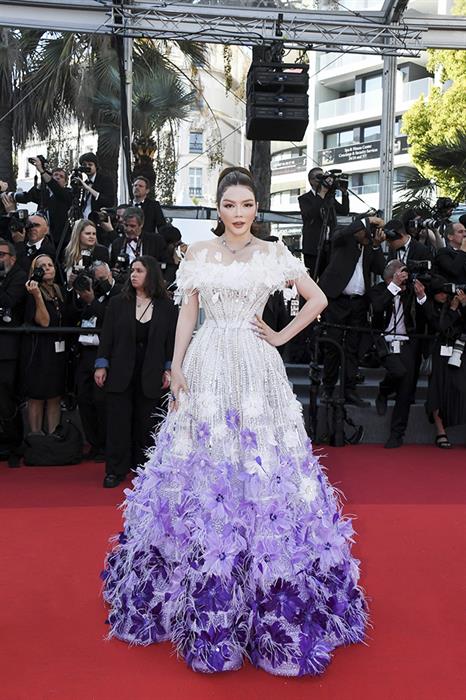 Thiết kế mang sắc tím ombre và phom dáng tùng xòe, gợi cho người đối diện liên tưởng đến hình ảnh những cánh đồng oải hương trải dài. Điểm nhấn của bộ trang phục là chi tiết những bông hoa được làm thủ công, kết hợp cùng lông vũ đàn xen vào nhau tạo cảm giác nhẹ nhàng, bay bổng. Lý Nhã Kỳ như một nàng công chúa với nhan sắc rạng rỡ khi xuất hiện trên thảm đỏ.