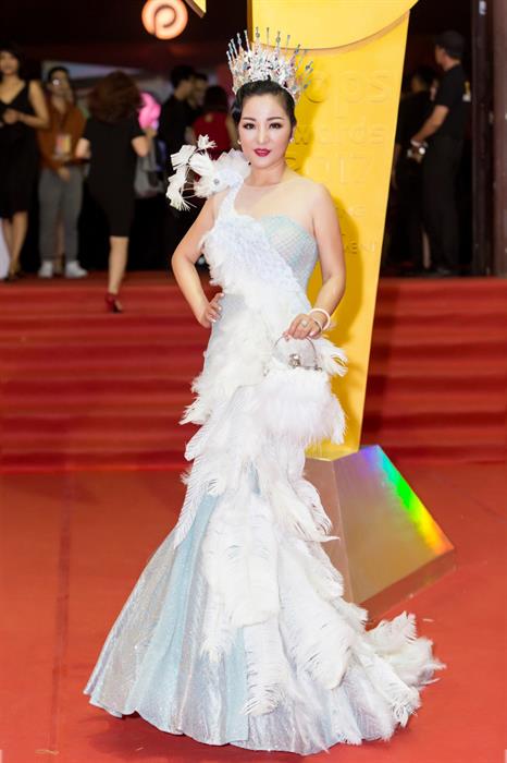 Tối 17/1, xuất hiện trên thảm đỏ của lễ trao giải âm nhạc Pops Awards 2017, Thuý Nga gây ấn tượng mạnh với quan khách trong bộ đầm chim công sang trọng như công chúa của NTK Tuấn Huỳnh. Để phát huy được hết phom dáng và sự kỳ công của bộ đầm, Thuý Nga chấp nhận “làm bạn” với đôi giày có chiều cao ‘khủng” kèm theo vương miện trên đầu.