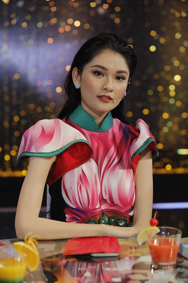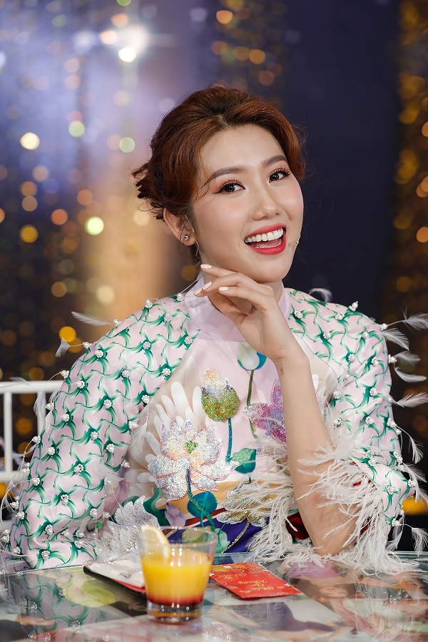 Mở màn trong trang phục áo dài cách tân hiện đại với chi tiết lông vũ phối với họa tiết thanh nhã đậm hồn Việt, Thúy Ngân quả thật hút trọn mọi ánh nhìn. Kết hợp cùng tóc búi cổ điển và phần mái uốn cong nhẹ nhàng đơn giản càng làm nổi bật làn da xuân sắc và gương mặt thanh tú của “Hân hoa hậu.” Nữ diễn viên Gạo Nếp Gạo Tẻ cười tươi hết cỡ lộ đồng điếu duyên dáng hờ hững ở khóe môi. Ngoài cảm giác hồi hộp khi được cùng Trấn Thành và các đồng nghiệp dẫn dắt chương trình, Thúy Ngân cũng vô cùng chờ mong được nhập “hội bàn tròn” giao lưu cùng các nhân vật đình đám Vbiz.