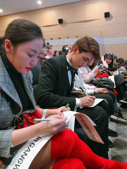 Văn Mai Hương xuất hiện với blazer vest kẻ mix cùng quần short ngắn, boots đỏ sành điệu và túi hàng hiệu. Trong khi đó diễn viên Bình An lại mặc suit bảnh bao. Khi sóng đôi đến dự fanmeeting của Lee Dong Wook, phong cách của hai nghệ sĩ Việt Nam đã gây ấn tượng cho không ít báo chí châu Á như Trung Quốc, Malaysia, Hong Kong, Đài Loan... Nhiều người đã vây quanh xin chữ ký và chụp hình cùng Văn Mai Hương, Bình An.
