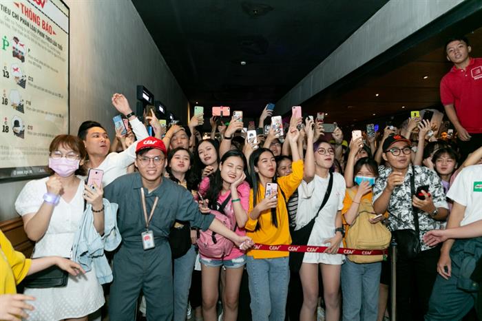 Tại cụm rạp CGV Landmark 81 tiếp đó, màn xuất hiện bất ngờ của Sơn Tùng M-TP cũng khiến người hâm mộ hò reo. Rất nhiều bạn học sinh liên tục hú hét khi mình là vị khách may mắn được ngồi trong suất chiếu có thần tượng xuất hiện. Một bạn chia sẻ: “Tụi em đặt vé từ hôm qua, rủ nguyên cả nhóm tan học về đi xem suất chiếu này. Gặp được anh Tùng ở khoảng cách gần như vậy bất ngờ và đặc biệt lắm. Đây sẽ là một kỷ niệm đặc biệt và làm em càng thêm háo hức về bộ phim sắp xem”.