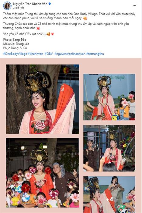 Trên trang cá nhân, Khánh Vân cũng vừa chia sẻ lại những khoảnh khắc đáng nhớ cùng các em nhỏ đêm qua. Nàng hậu viết: “Thêm một mùa Trung thu ấm áp cùng các con nhà One Body Village. Thật vui khi Vân được thấy các con hạnh phúc, vui vẻ và trưởng thành hơn mỗi ngày. Thương Chúc các con và Cả nhà mình một mùa trung thu ấm áp và luôn ngập tràn tình yêu thương, hạnh phúc nhé! Vân yêu Cả nhà OBV rất nhiều”.