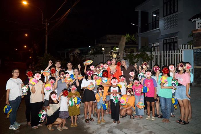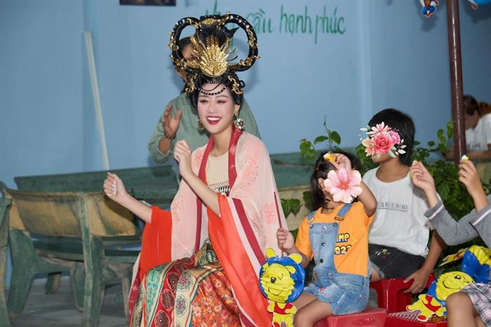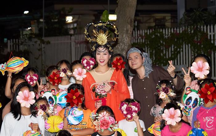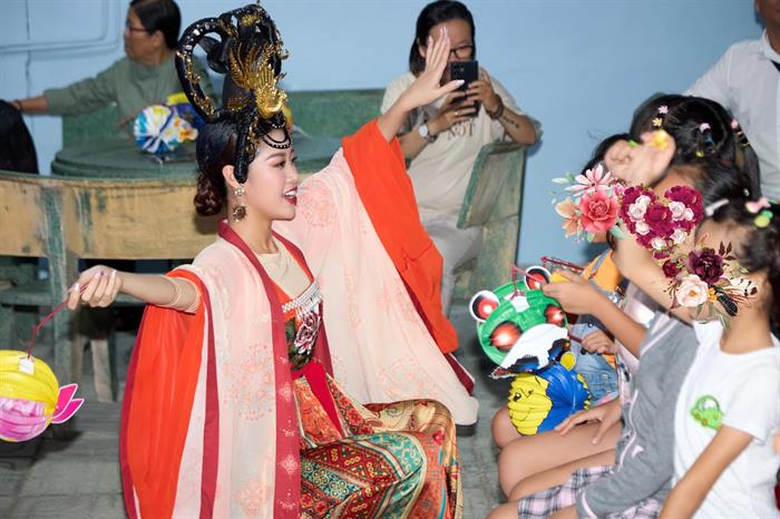 Hoa hậu Khánh Vân tặng đèn lồng và vui chơi cùng các em nhỏ.