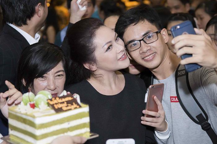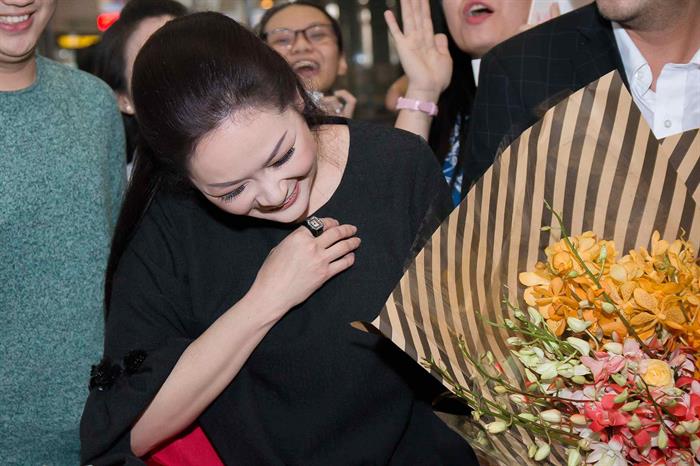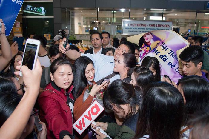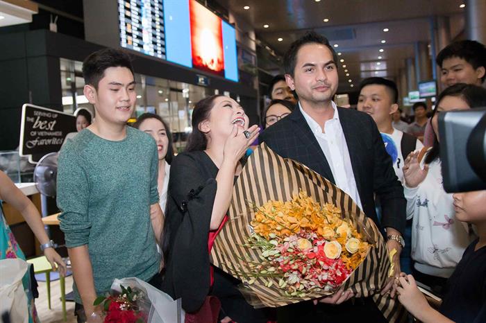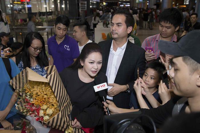 Nữ ca sĩ vô cùng hạnh phúc khi đông đảo người hâm mộ có mặt tại sân bay Tân Sơn Nhất, TP.HCM chờ sẵn với băng rôn, hoa và poster chào đón mình trở về. Mặc dù đáp chuyến bay khá muộn, giọng ca "Duyên phận" vẫn vui vẻ khi gặp người hâm mộ. Siêu mẫu Đức Tiến cũng có mặt để chào mừng chị trở về.