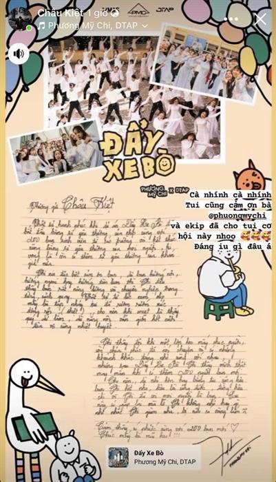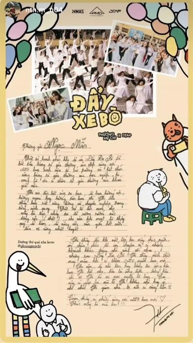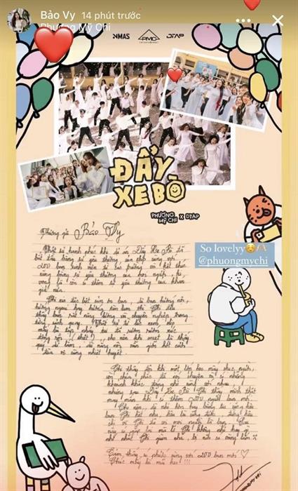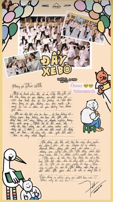 Tấm thiệp được Phương Mỹ Chi nắn nót viết tay, với hình ảnh kỷ niệm trong MV cùng các bạn. Có thể thấy nữ ca sĩ đã đặt hết tâm tư tình cảm để gửi lời cảm ơn chân thành đến 200 bạn trẻ.