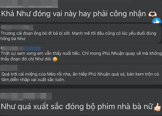 Trang cá nhân của Khả Như cũng ngập tràn lời thắc mắc về số phận của nhân vật Phú Nhuận và lời tiếc nuối trước cái cái kết chia ly của đôi Như – Nhuận. Sự quan tâm của khán giả dành cho tuyến tình cảm Như – Nhuận khiến nàng Mèo cảm thấy bất ngờ lẫn hạnh phúc.