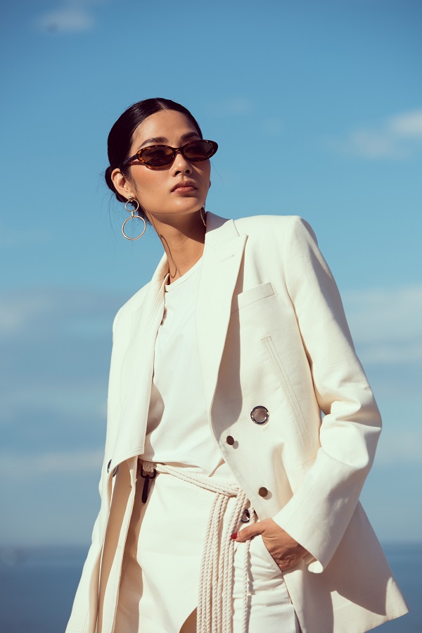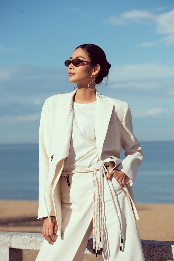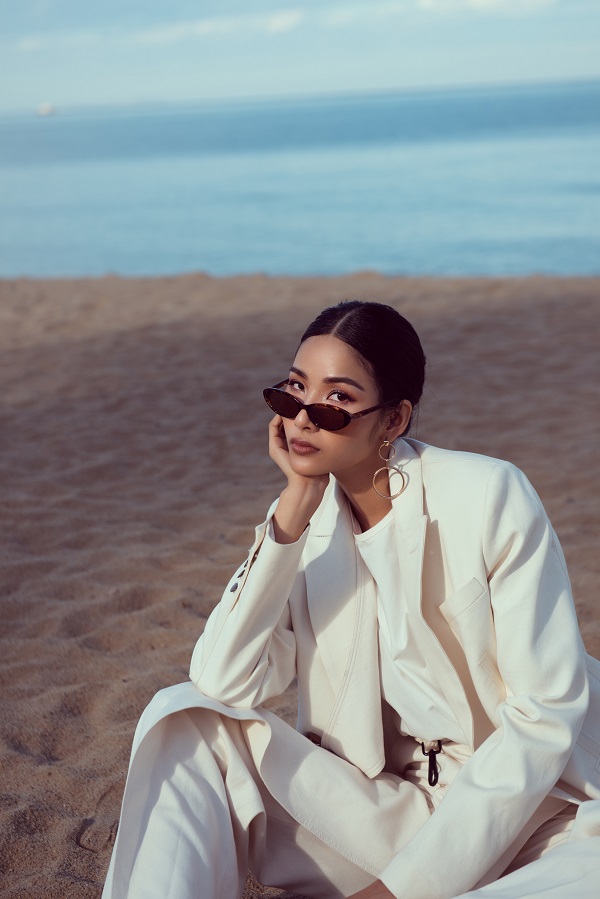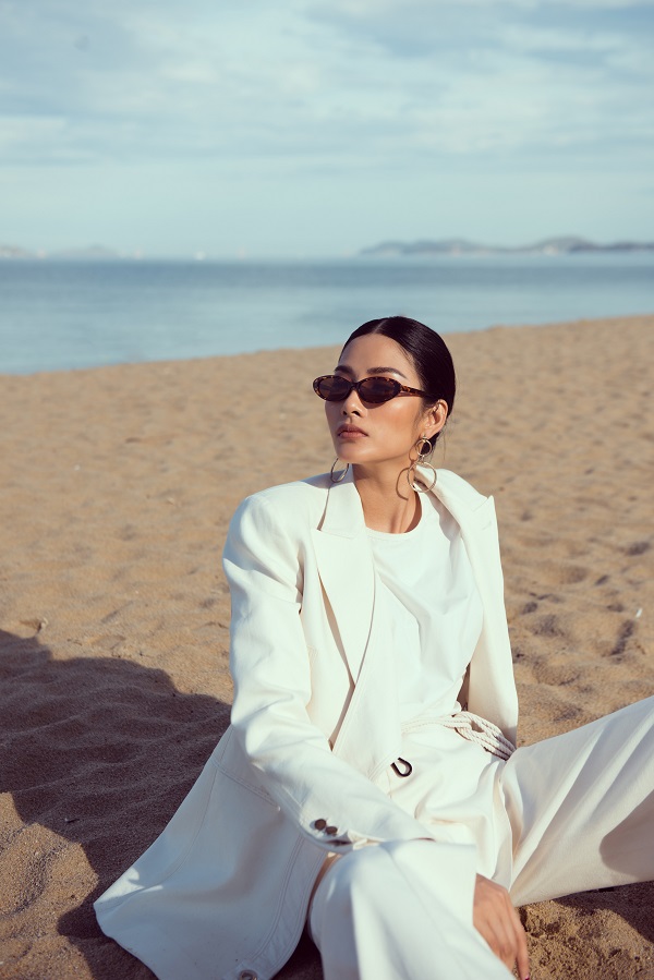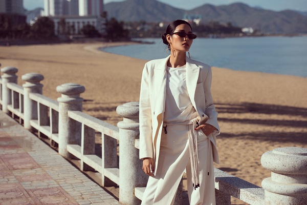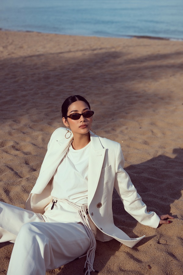 Trong bộ ảnh thứ hai thực hiện ở bãi biển, Á hậu Hoàng Thùy chọn sắc trắng với trang phục của Lâm Gia Khang, kết hợp cùng mắt kính đen, tôn vinh gương mặt góc cạnh và làn da nâu khỏe mạnh.