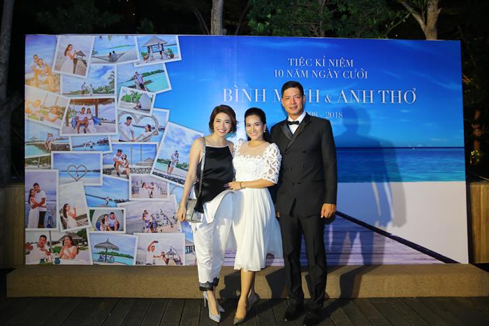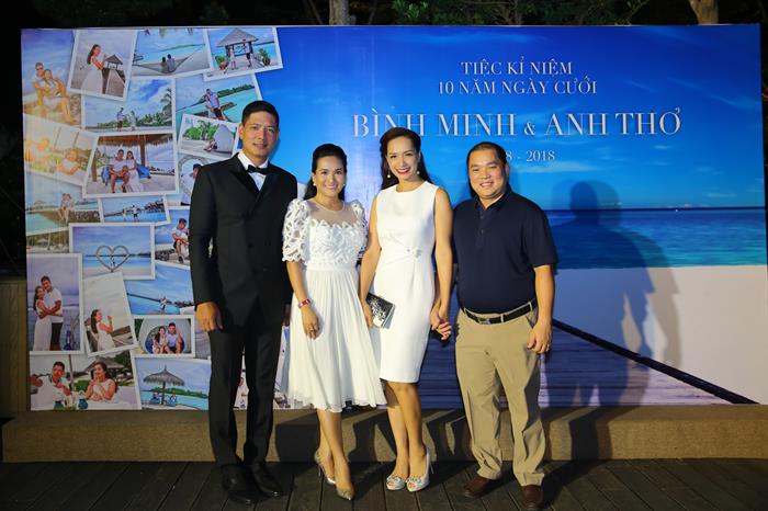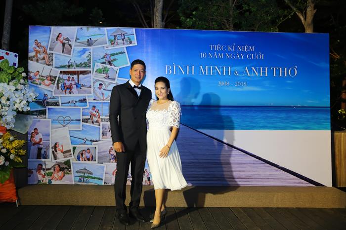 Trải qua nhiều sóng gió, sau 10 năm bên nhau, Bình Minh – Anh Thơ cùng hai công chúa nhỏ tạo nên một hình mẫu gia đình lý tưởng trong showbiz Việt. Anh Thơ ngoài công việc chính về quản lý giáo dục còn là một hậu phương vững chắc cho Bình Minh trong công việc cũng như cuộc sống. Tại buổi tiệc, Anh Thơ xúc động chia sẻ “Để có được 10 năm gian khổ với ‘đồng chí’ này, Thơ cũng đã nhận được sự yêu thương, chia sẻ của mọi người rất nhiều, những người lúc nào cũng sẵn sàng làm “thùng rác” để Thơ trút. Thơ cũng không biết nói gì hơn ngoài lời cảm ơn đến tất cả mọi người”.