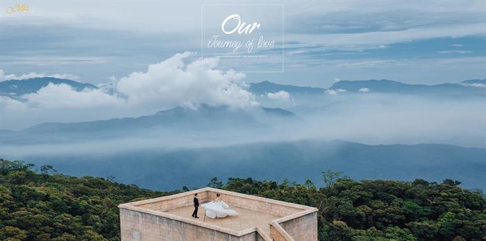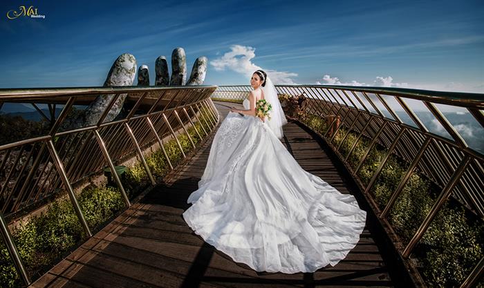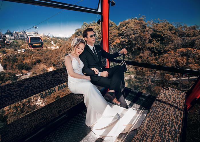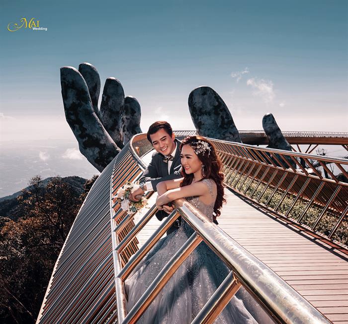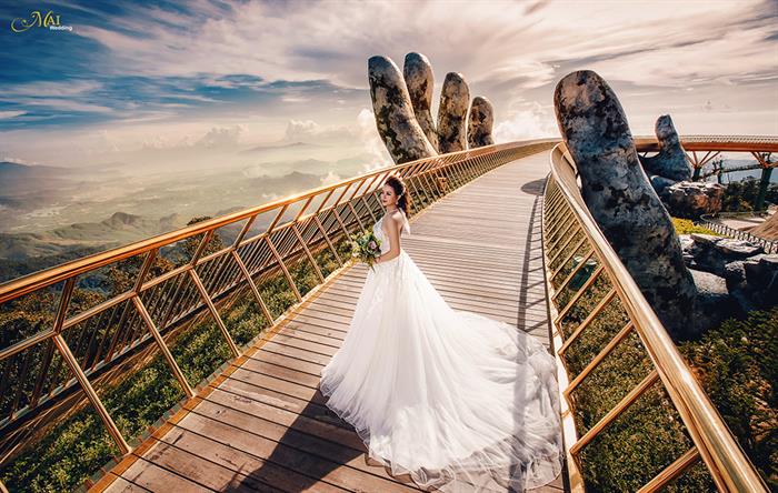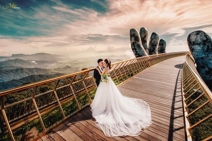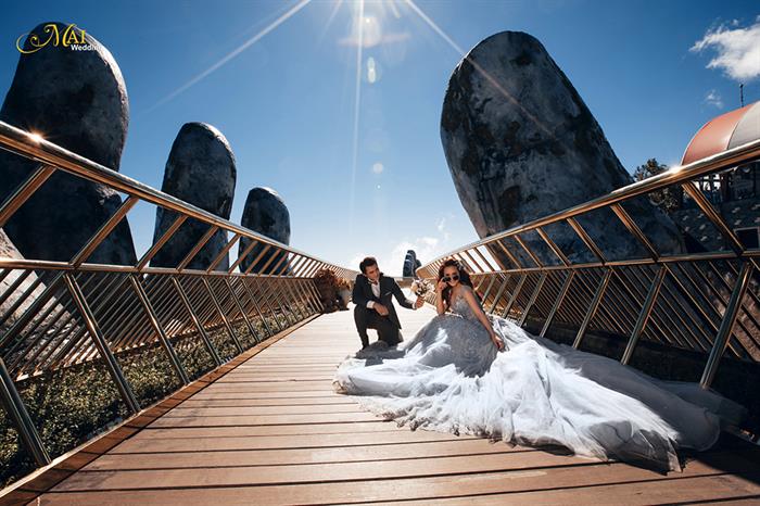 Địa điểm được Hà Việt Dũng chọn chụp ảnh cưới ở Đà Nẵng là Cây Cầu Vàng. Đây liệt tác nghệ thuật có 1-0-2 đã thu hút hàng trăm nghìn khách du lịch trong và ngoài nước từ đầu tháng 6/2018 đến nay. Hình ảnh ấn tượng của đôi bàn tay khổng lồ với độ cao 1.414m đã trở thành điểm check-in hot nhất của năm.