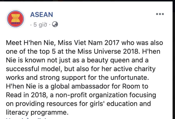 Tintuc - Mới đây, Hoa hậu H’Hen Niê được vinh danh là “ASEAN Pride – Niềm tự hào Đông Nam Á” trên fanpage chính thức của tổ chức ASEAN. Fanpage có gần 800 ngàn lượt theo dõi.
