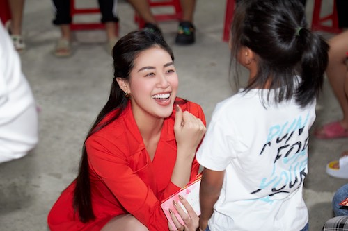Cùng với những phong bao lì xì, Hoa hậu Khánh Vân không quên gửi lời chúc đến các cô, các em nhỏ tại OBV và lần lượt nghe từng em hứa năm nay sẽ đạt được thành tích gì làm quà tặng cho cô Khánh Vân.