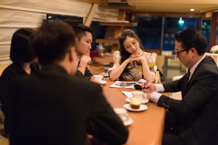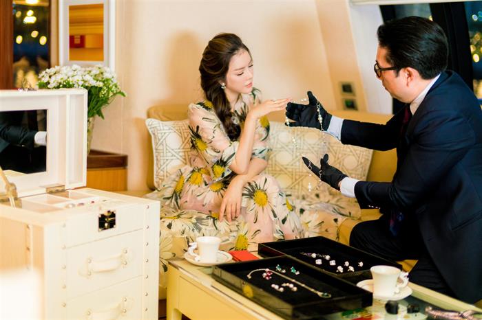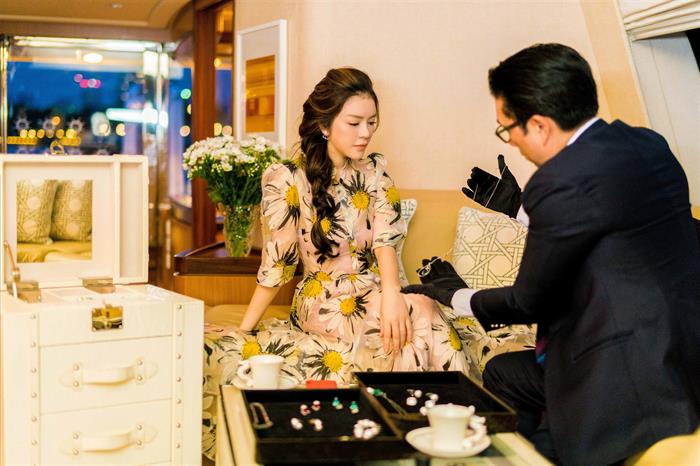 Ngắm nhìn khoảnh khắc giản dị, trẻ trung của người đẹp khi làm việc cùng các nhân viên của mình trên du thuyền khiến nhiều người phải thán phục. Trông cô lúc nào cũng hừng hực năng lượng và tươi trẻ, không có vẻ gì là mệt mỏi. Trong bộ váy jeans giản dị, trẻ trung, hay trong chiếc đầm hoa đầy nữ tính, bà chủ kim cương luôn tràn đầy năng lượng làm việc với lĩnh vực mà cô đam mê. Không gian thoáng đãng trên sông cùng ánh nắng tự nhiên giúp cho việc ngắm những tuyệt tác trang sức thế giới càng thêm thi vị. Không gian nhỏ ấm cúng mà sang trọng của du thuyền Ferretti Yachts, là thương hiệu cao cấp mà nhiều ngôi sao nổi tiếng thế giới sở hữu, sẽ mang lại cho người mua hàng cảm giác được đón tiếp như những thượng khách.
