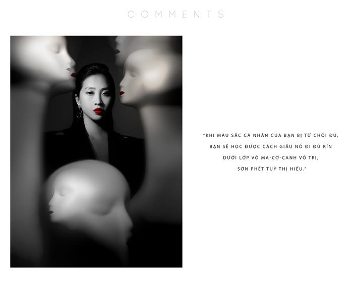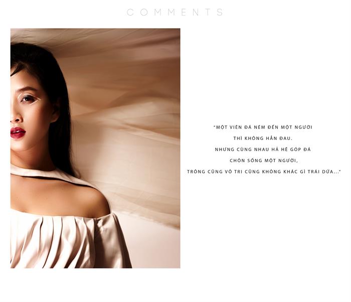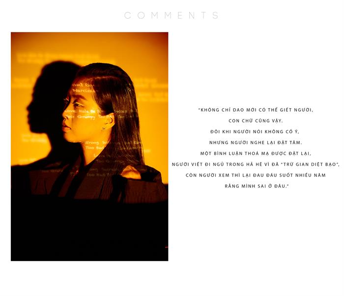 Mới đây, nữ MC 8X đã thực hiện bộ ảnh “COMMENTS”, với ý tưởng thực hiện từ những nỗi sợ nôm na mà cả cô và ekip đã luôn trăn trở bấy lâu như cách mà Đen Vâu đã rap: “Ở trong rừng an toàn hơn là ở trên mạng. Một mình vẫn tốt hơn là mất thêm bạn.”