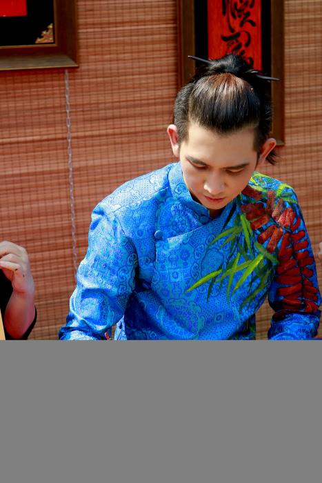 Gobi Vũ, thư pháp Hồng Lĩnh và ông Nguyễn Quốc Dũng – Quận uỷ viên, Trưởng phòng Kinh tế Quận 5 chụp ảnh lưu niệm ở buổi lễ khai mạc Phố chữ Văn Lang.