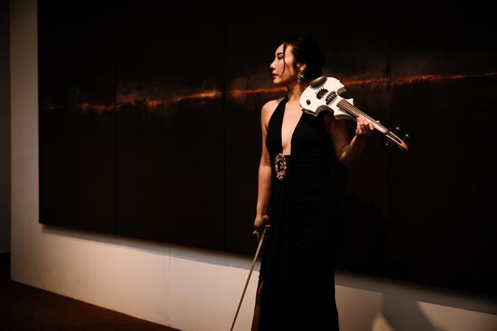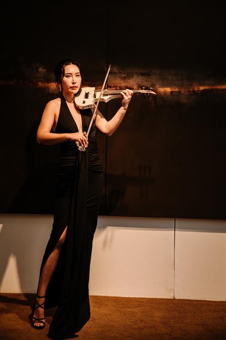 Sự xuất hiện của Jmi Ko cùng những giai điệu vĩ cầm lúc trầm lúc bổng đầy hùng cường như thổi thêm hồn vào không gian nghệ thuật hội họa nơi đây, khiến buổi triển lãm thêm phần thu hút.