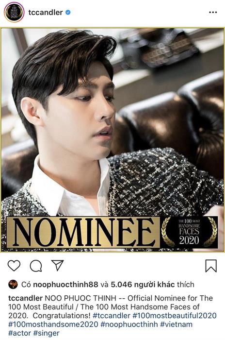 Theo đó mới đây, TC Candler đã công bố Noo Phước Thịnh chính là nam nghệ sĩ tiếp theo của Việt Nam lọt đề cử 100 gương mặt đẹp nhất thế giới 2020. Đây là bất ngờ lớn đối với bản thân Noo Phước Thịnh nói riêng và người hâm mộ nói chung. Bởi những nhân vật được TC Candler lựa chọn đều là tên tuổi có tiếng vang trong mỗi lĩnh vực họ tham gia, sở hữu vẻ ngoài nổi bật theo từng khu vực.