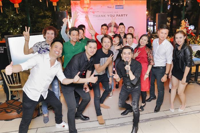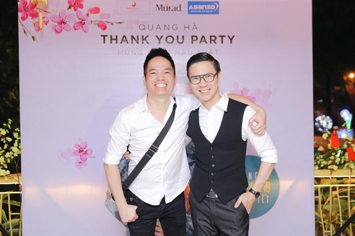 Trong buổi tiệc thân mật này, nhiều đối tác, đồng nghiệp và bạn bè đã đến chung vui với chàng ca sĩ gốc Bắc sau một năm thành công vang dội. Số lượng quà “khủng” dành tặng cho các khách mời trong buổi tiệc trị giá hơn 500 triệu đồng từ nhà tài trợ Asanzo, trong đó có những chiếc điện thoại do Quang Hà làm gương mặt đại diện và mỹ phẩm Murad.