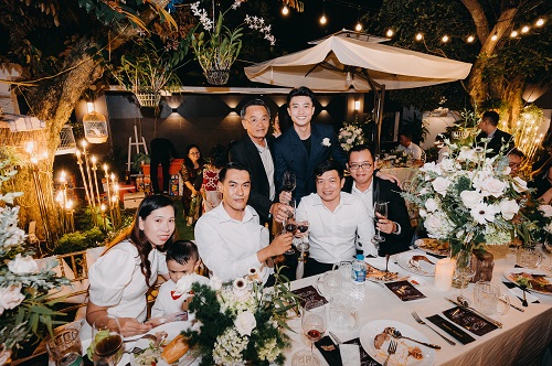 Trong buổi tiệc mừng kỷ niệm 40 năm ngày cưới của cha mẹ, Quốc Trường lựa chọn tone màu trắng sang trọng với hoa tươi được trang trí xung quanh để tạo điểm nhấn. Nam diễn viên và gia đình chỉ mời người thân, bạn bè tại quê nhà đến tham dự buổi tiệc. Quốc Trường diện vest đen gửi lời chúc mừng đến cha mẹ và cám ơn tất cả mọi người vì đã đến tham dự buổi tiệc. Nam diễn viên không giấu được niềm xúc động hạnh phúc vì đã mang đến một món quà rất ý nghĩa cho hai đấng sinh thành.