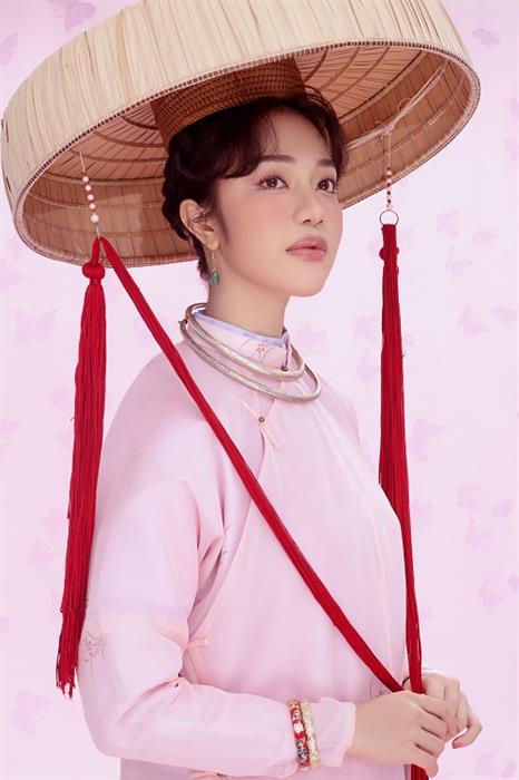Set đội nón Nghệ với quai tơ màu đỏ, đầu búi tóc và cổ đeo kiềng chạm, kết hợp cùng áo Mớ Ba của miền Bắc với việc lồng nhiều lớp áo ngũ thân khác màu.