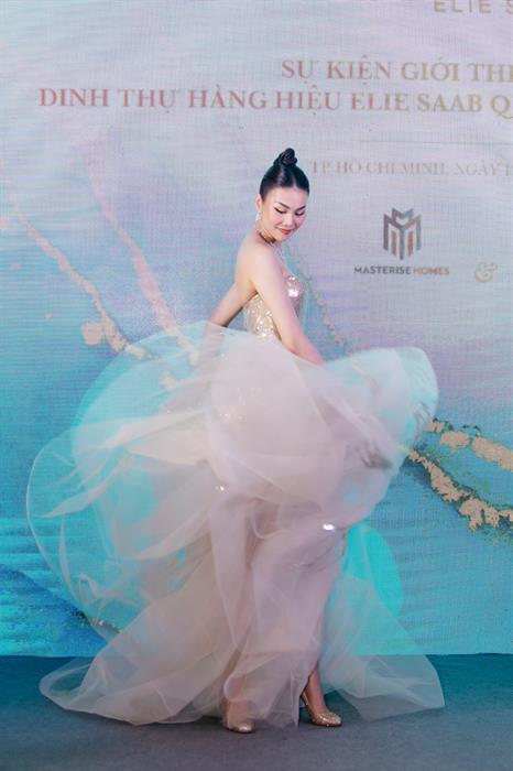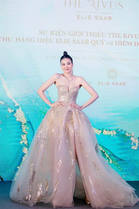Chị đại làng mốt Việt khoác trên mình chiếc váy xòe cúp ngực, xẻ tà với phần ánh kim rải đều khắp thân váy mang đậm chất haute couture đến từ nhà mốt Elie Saab.
