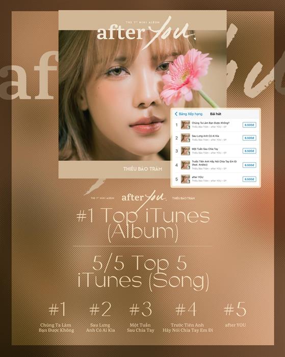 Mini album ‘after YOU' được Thiều Bảo Trâm phát hành vào ngày 7/6, nhanh chóng leo thẳng Top 1 BXH Album được nghe nhiều nhất của iTunes Việt Nam. Cả 5 ca khúc trong mini album cũng lần lượt giữ vị trí Top đầu BXH Ca khúc được nghe nhiều nhất của iTunes Việt Nam. MV “Chúng Ta Làm Bạn Được Không?” trụ nhiều ngày ở vị trí Top 5 Trending Music của YouTube Việt Nam, với hơn 2 triệu lượt xem và hơn 53 nghìn lượt yêu thích.