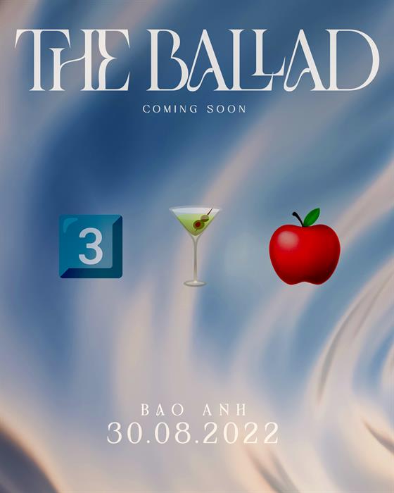 Đồng thời, Bảo Anh khiến người hâm mộ hào hứng khi chính thức thông báo trở lại đường đua âm nhạc với một sản phẩm ballad. Nữ ca sĩ “nhá hàng" bằng poster Back To The Ballad, hẹn khán giả vào ngày 30/8/2022 và còn gợi ý về sự kết hợp mới mẻ, thú vị giữa Bảo Anh cùng 2 nhân vật bí ẩn qua biểu tượng số 3, ly cocktail và trái táo. Cộng đồng mạng lập tức đưa ra loạt bình luận về những cái tên sẽ bắt tay với Bảo Anh như rapper Táo - hình trái táo, hay nhạc sĩ LyLy - hình chiếc ly…