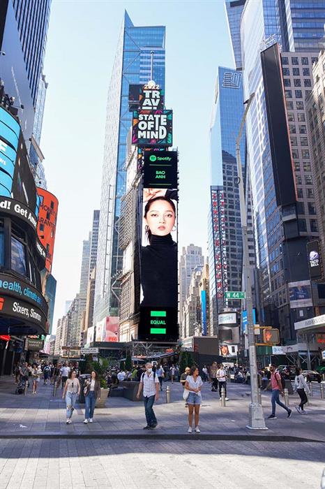 Tintuc - Sáng ngày 22/8, Bảo Anh đã chia sẻ hình ảnh đầy thần thái của mình khi xuất hiện trên billboard tại quảng trường Thời Đại (New York, Mỹ). Nhân dịp trở lại với đường đua âm nhạc, Bảo Anh vinh dự trở thành nữ nghệ sĩ Việt Nam đại diện chiến dịch EQUAL của Spotify trong tháng 8.