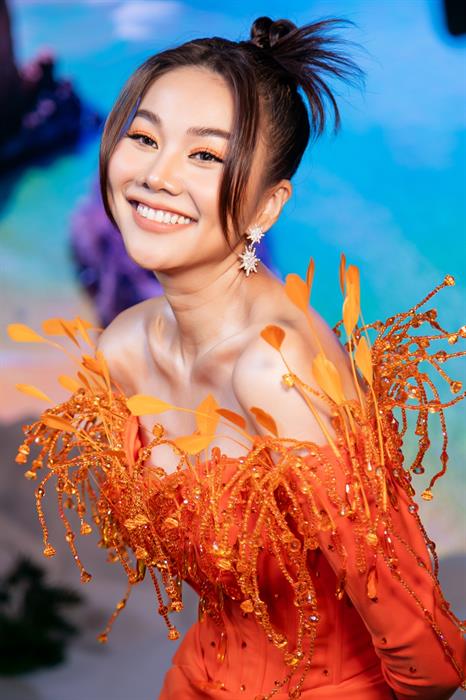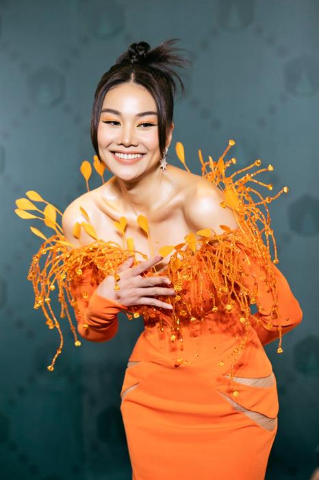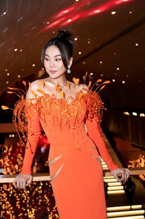 Ngoài chiếc đầm màu cam nóng bắt mắt, Thanh Hằng còn lựa chọn lối trang điểm ton-sur-ton với màu mắt cam gợi cảm tạo nên phong cách không thể ấn tượng hơn.