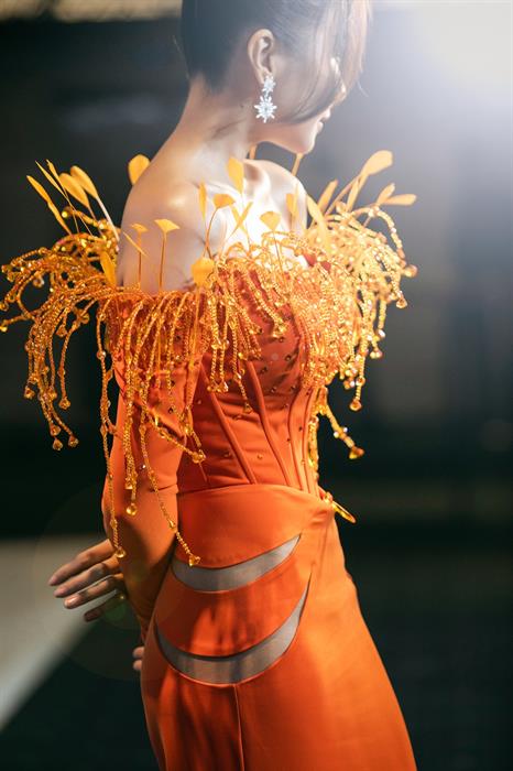 Bên cạnh đó, những chi tiết đính kết tỉ mỉ phần ngực tạo hiệu ứng khi di chuyển giúp ''chị đại'' làng mốt Việt càng thêm quyến rũ.