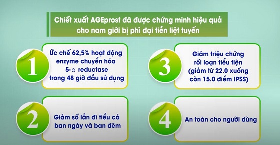 AGEprost là hoạt chất đứng đầu trong việc hỗ trợ điều trị bệnh lý phì đại tuyến tiền liệt. Và được đánh giá cao về các ưu điểm: được chiết xuất từ giống cây hoa ngũ sắc giàu hoạt tính sinh học từ vùng biển Caribe bởi GE Nutrients (Mỹ) bằng công nghệ hiện đại độc quyền. AGEprost có hai tác động chính là giảm kích thước phì đại tiền liệt tuyến và giảm rối loạn tiểu tiện. Bên cạnh đó, chiết xuất AGEprost đã được cấp bằng bảo hộ của Hoa Kỳ và giấy chứng nhận của Cục quản lý Thực phẩm & Dược phẩm FDA của Hoa Kỳ.