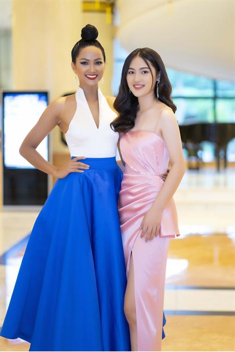 Tại buổi giao lưu Hoa hậu H'hen Niê diện chiếc váy xanh bồng bềnh nổi bật, trong khi đó Á hậu Võ Hoàng Yến lại diện thiết kế cá tính với thần sắc lạnh lùng, kiêu sa.