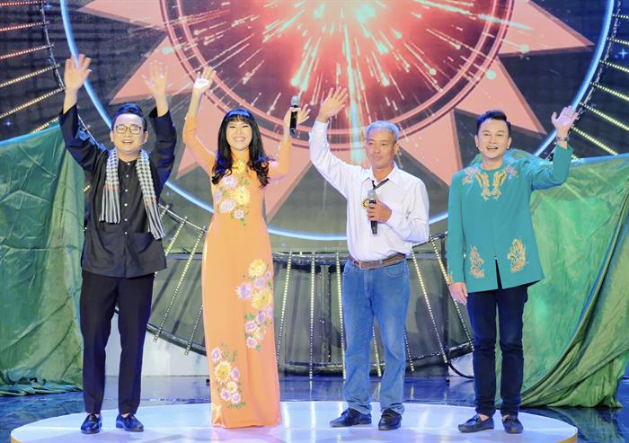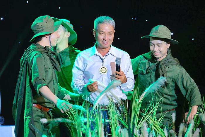 Để khuấy động không khí, nông dân Lê Văn Sáu gửi tặng đến khán giả ca khúc Trường Sơn Đông Trường Sơn Tây kết hợp cùng MC Quỳnh Hoa tại sân khấu Nông Dân Xin Chào.