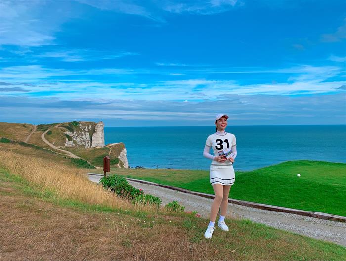 Đi tới miền tây bắc nước Pháp, Hải Anh tiếp tục hoàn thành mong muốn được đánh ở sân golf trên đinh các vách đá trắng, sát cạnh bờ biển xanh và sau lưng là những cánh đồng trải rộng tầm mắt, đó là GOLF D’ETRETAT. Sân được xây dựng từ năm 1908 trên vùng biển Normandy, sân golf tuyệt đẹp và dường như không quá khó với điều kiện thời tiết tốt, nhưng với một sân dạng link, thì yếu tố gió biển là điều không thể tránh khỏi và nó thực sự thách thức người chơi.