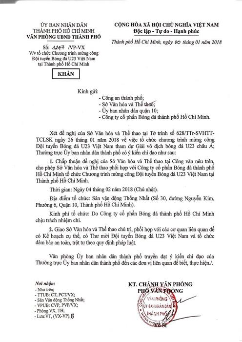 Tintuc - UBND TPHCM vừa có công văn khẩn về gửi các sở ban ngành về việc phối hợp tổ chức chương trình giao lưu Đội tuyển bóng đá U23 Việt Nam tại TPHCM.