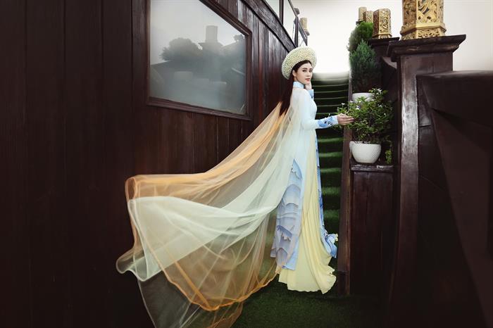 Muốn tập trung hoàn toàn vào vẻ đẹp của áo dài nên Lý Kim Thảo cũng rất khéo léo trong việc làm tóc, chọn phụ kiện. Cô lựa chọn kiểu tóc suôn thẳng, nhấn nhá thêm những chiếc cài tóc đính hạt ngọc trai, điểm xuyết những đôi bông tai ngọc trai vừa thể hiện đúng chủ đề bộ ảnh, vừa giúp người đẹp trông tinh tế hơn.
