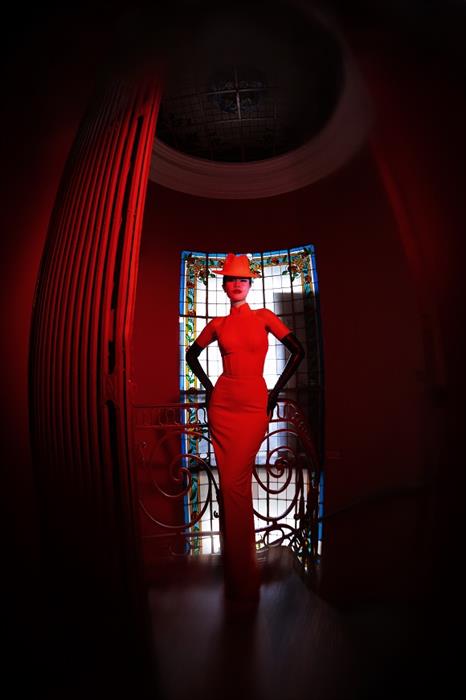 Ở chiếc váy màu đỏ bó sát, Thủy Tiên toát lên vẻ bí ẩn và quyến rũ. Điểm cộng đặc biệt của bộ trang phục này dành cho NTK khi rất tài tình dựng phom váy theo kiểu dáng áo dài cổ điển, giúp người mặc khoe trọn đường cong gợi cảm. Chiếc mũ cũng là điểm nhấn tạo nên sự phá cách cho tổng thể bộ trang phục này.