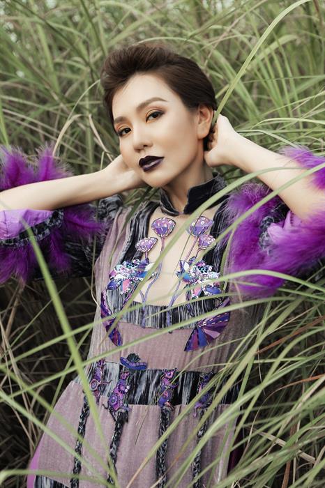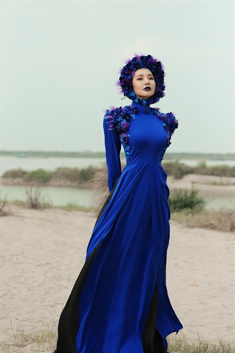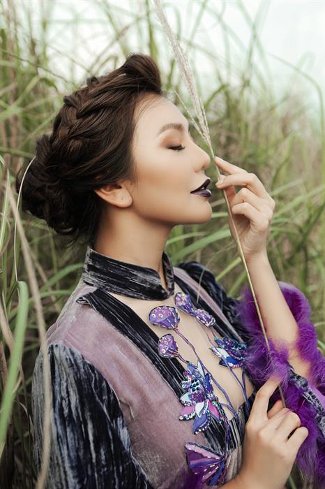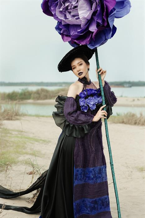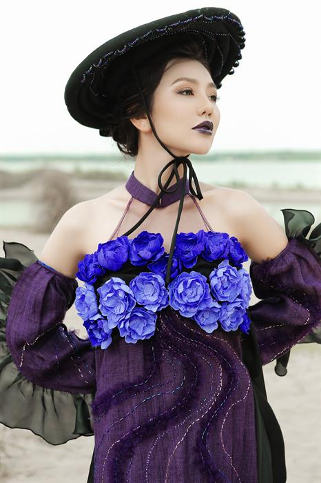 Mùa Hoa Tím với những chiếc áo dài được sử dụng đa dạng chất liệu, từ nhung mượt mà đằm thắm, chất vải lanh được dệt thủ công từ những người dân vùng núi Tây Bắc, hay chất lụa mềm mại nhẹ nhàng bay bổng. Sắc tím hoà quyện cùng sắc xanh cổ điển, cùng tạo nên một tổng hoà khác lạ.