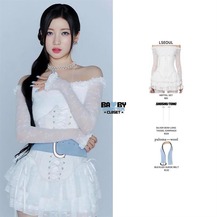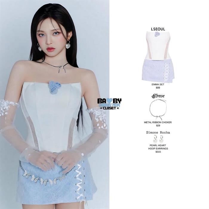 Trong MV ‘Forever’, giọng ca chính của nhóm là Rami đã diện chiếc đầm mang cái tên rất thơ, hệt như sự nữ tính mà thiết kế này mang lại - Réthérée Dress nằm trong bộ sưu tập Belle Rébellion. Réthérée có ý nghĩa là “tinh khiết”, người phụ nữ mặc lên chiếc đầm này có vẻ đẹp thuần khiết như thiên thần, dẫu thế, họ cũng không kém phần mạnh mẽ để đối mặt với những thử thách từ trần gian. Bên ngoài chiếc đầm, Rami còn chọn thêm chiếc áo corset Rita để tổng thể trang phục vừa nhẹ nhàng nhưng cũng vừa quyến rũ. Sự mộng mơ xen lẫn trầm lắng của Réthérée Dress được nữ ca sĩ thể hiện rất xuất sắc. Tiếp theo, “maknae" Chiquita khoe trọn vẻ sexy, cá tính của mình trong Emma Set trong bộ sưu tập Sister Sister. Emma Set là sự thời thượng được LSEOUL mang đến cho các cô gái với chiếc áo corset được phối từ hai chất liệu xu hướng denim và ren. Chi tiết cắt xẻ, thắt eo tinh tế đủ khoe lên đường cong của cô gái trẻ. Điểm nhấn hoa hồng ngay giữa ngực áo hay ruy băng đan chéo dọc hông càng khiến cho bộ outfit dễ dàng trở thành tâm điểm của sự chú ý. Điển hình là việc Emma Set đã cùng Chiquita làm center trong teaser, phân cảnh đầu của bài hát mới.
