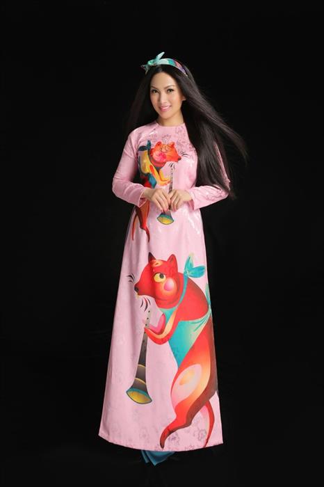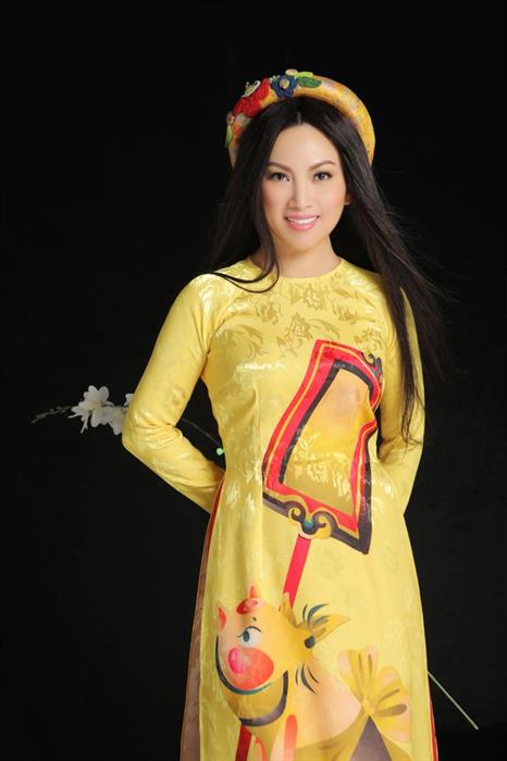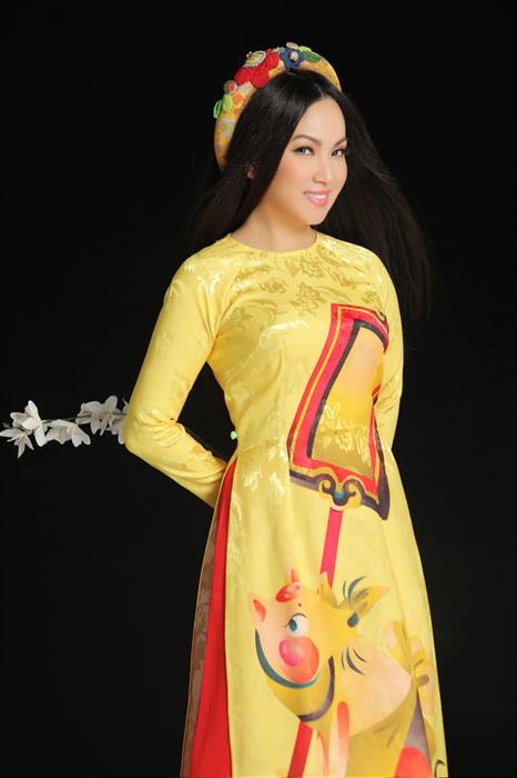 Trong bộ ảnh mới, Hà Phương diện áo dài họa tiết rực rỡ của nhà thiết kế Thủy Nguyễn. Tà áo dài truyền thống trở nên tươi vui hơn khi được in hình những con giáp may mắn theo quan niệm truyền thống.