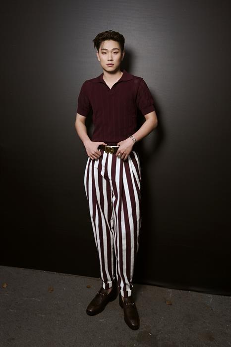Dương Domic thời thượng với thiết kế mới nhất từ BST Xuân-Hè 2025 từ nhà mốt Dolce&Gabbana – áo polo lưới cotton ngắn tay màu burgundy – gam màu đang dẫn đầu xu hướng mùa này – phối cùng quần jacquard kẻ sọc hai ly.