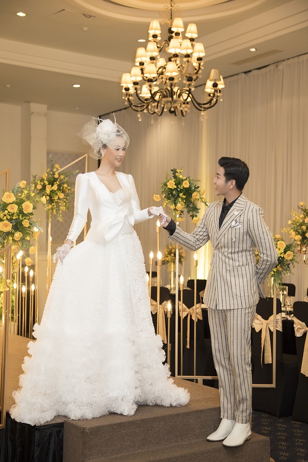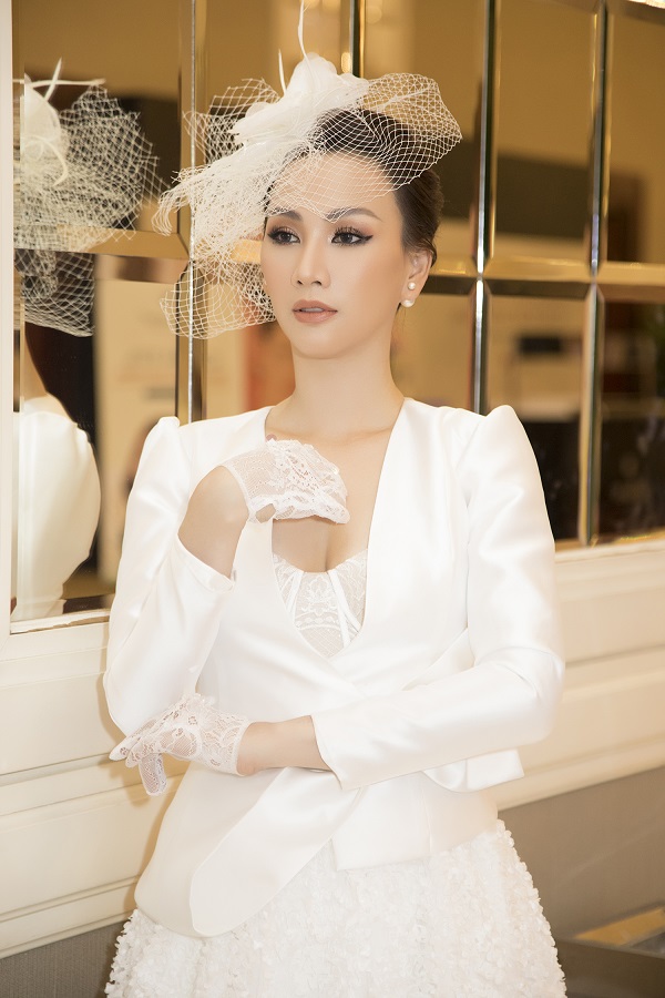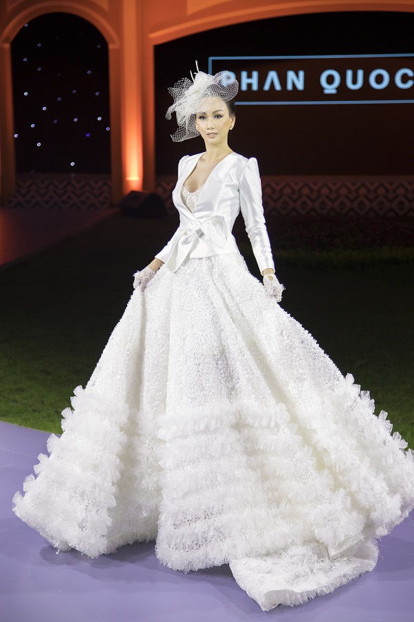 Trang phục sắc trắng phong cách cổ điển của những thập niên trước với đường cắt bán cổ điển, mang hơi hướng hiện đại mới với tỷ lệ cấu trúc được thay đổi, form dáng lượt giản nhẹ nhàng, váy xếp tầng duyên dáng và sắc trắng tinh khiết như biến hoa hậu Paris Vũ trở nên sang trọng như một quý cô quý tộc trên đường băng.