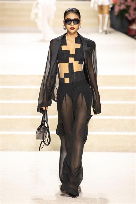 Với gu thẩm mỹ cao cấp, Joey King tìm thấy tuyên ngôn phong cách trong mẫu áo xuyên thấu kết hợp cùng quần tây và blazer từ BST Xuân/Hè 2024 của Công Trí. Phần trên của trang phục là những hình khối được lấy cảm hứng từ “QR code” – một phần không thể thiếu của nhịp sống hiện đại, kèm theo đó là một số khoảng hở vừa vặn cho phần chân ngực lấp ló của người mặc.