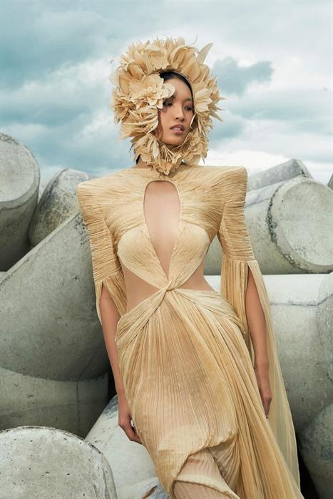Cô mặc look #78 trong BST Xuân/Hè 2024 của Công Trí. Có thể thấy so với người mẫu thể hiện trên runway thì ekip đã phục sức một cách tiết chế hơn để phù hợp với thị hiếu đại chúng.