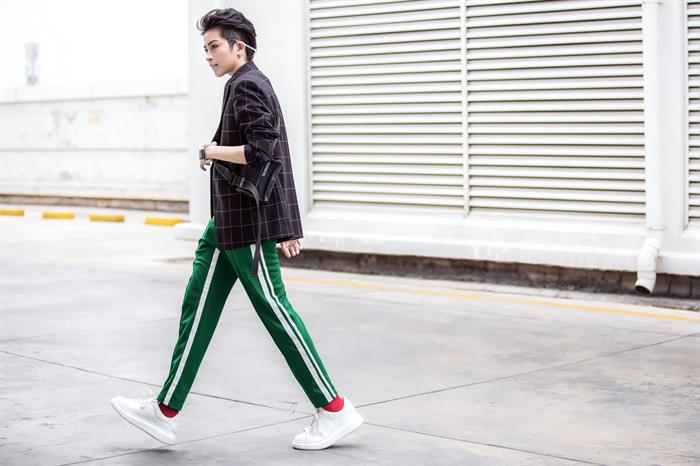 Ở set quần áo đầu tiên, Gil lựa chọn Suit ca-rô trắng đen khoác ngoài áo T-shirt xanh lá có họa tiết, phía dưới là quần thể thao chất liệu thun cùng màu với áo trong. Phụ kiện là đôi Sneaker trắng cùng chiếc túi đeo chéo vắt ngang từ vai xuống hông.