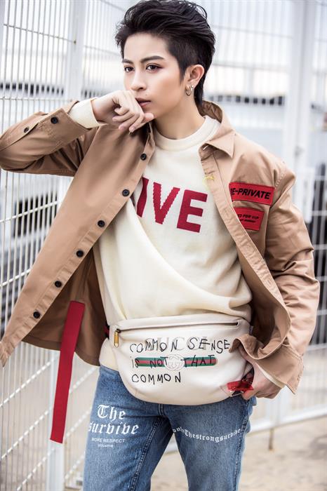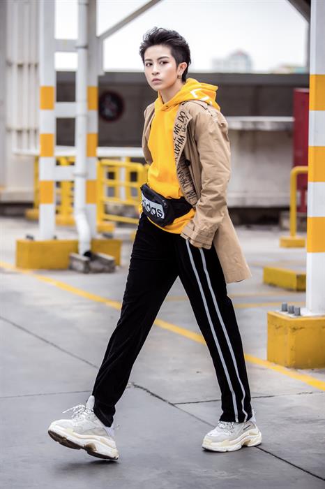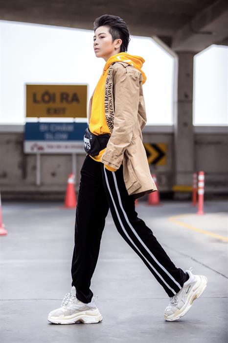 Tại set tiếp theo, Gil diện áo Hoodie vàng nghệ, bên ngoài khoác áo Măng-tô màu nâu nhạt với điểm nhấn họa tiết nơi cổ áo. Quần thể thao màu đen và chiếc túi “bao tử” vòng quanh hông hoàn thiện phong cách vừa khỏe khoắn, vừa cá tính, phù hợp với những người yêu thích sự thoải mái, phóng khoáng.