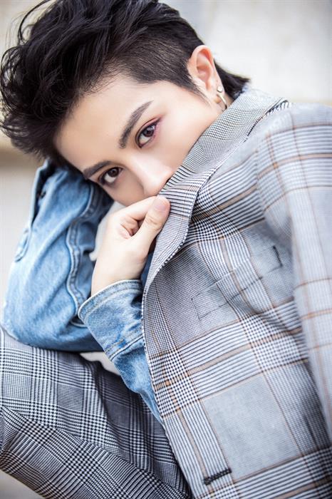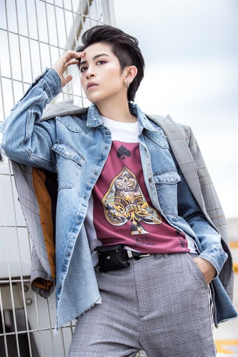 Vốn ưa thích trang phục thể hiện được sự năng động, thật thiếu sót nếu thiếu chất liệu jeans trong bộ ảnh. Suit ca-rô xám nhạt khoác bên ngoài áo jeans, áo T-shirt trắng họa tiết to bản ở trong cùng là một sự kết hợp khá lạ mắt mà Gil mang đến. Ở set phục trang này, nữ ca sĩ lựa chọn túi đeo thắt lưng đính đinh sắt làm phụ kiện.