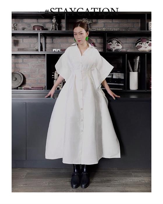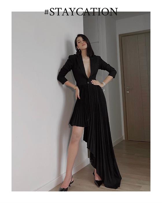 Dù ở nhà thì nàng hậu gem Z cũng vẫn lộng lẫy và sang trọng với chiếc váy có phần đuôi bất đối xứng độc đáo.