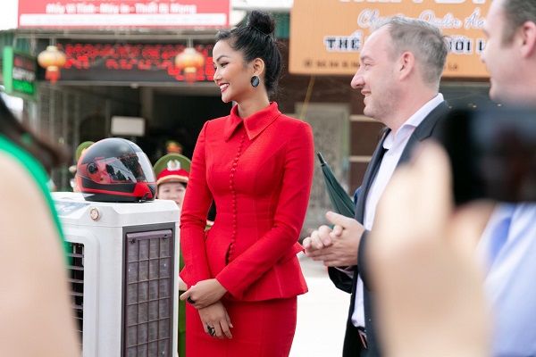 Tintuc - Sáng 22/05, Hoa hậu H’Hen Niê cùng đoàn đại biểu Đại sứ quán Anh và các cơ quan ban ngành tỉnh Nghệ An đã có mặt tại thị xã Cửa Lò, tổ chức chương trình tuyên truyền phòng, chống mua bán người. Hoa hậu H’Hen Niê xuất hiện nổi bật trong trang phục màu đỏ rực rỡ.