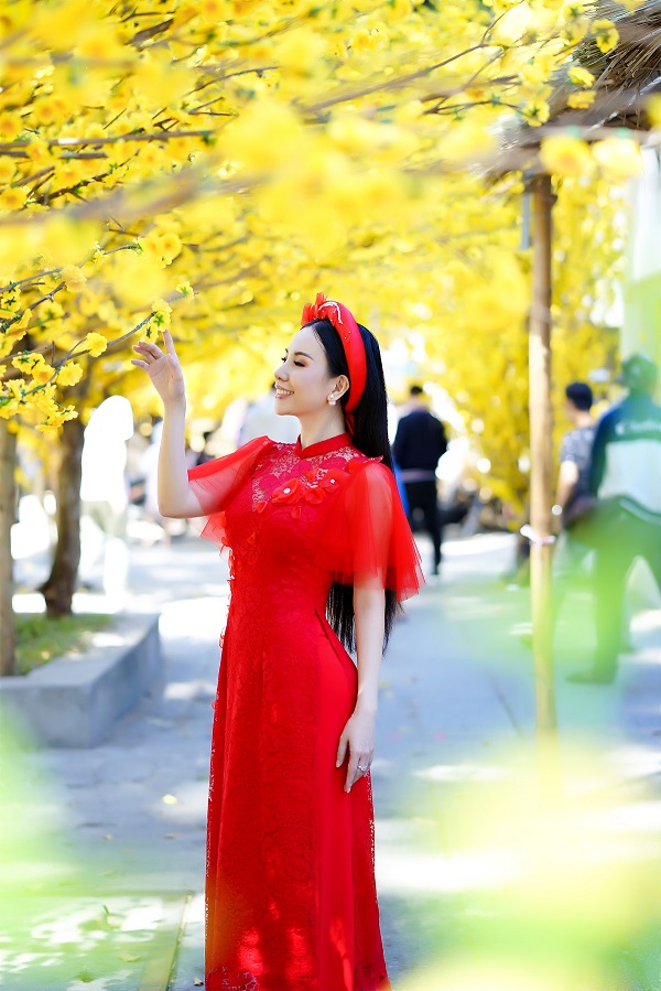 Hoa hậu không tạo kiểu mà để tóc đen thả dài suôn mượt, tự nhiên. Kiểu tóc truyền thống mang lại cảm giác dễ chịu, hài hòa, đặc biệt phù hợp với thiết kế áo dài họa tiết. Hoa Hậu Châu Ngọc Bích mang đến gợi ý cho ngày đầu năm với tông màu đỏ tươi cách điệu cùng mấn tròn thêu hoa.