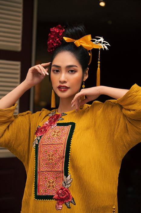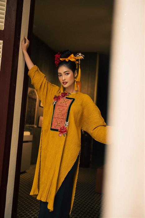 Theo đó, cô diện 4 thiết kế áo dài thổ cẩm đến từ NTK Cao Minh Tiến. Trên phom dáng của áo dài truyền thống, các họa tiết thổ cẩm được NTK Cao Minh Tiến lựa chọn và đặt để khéo léo nhằm kể một câu chuyện văn hóa nhất định.
